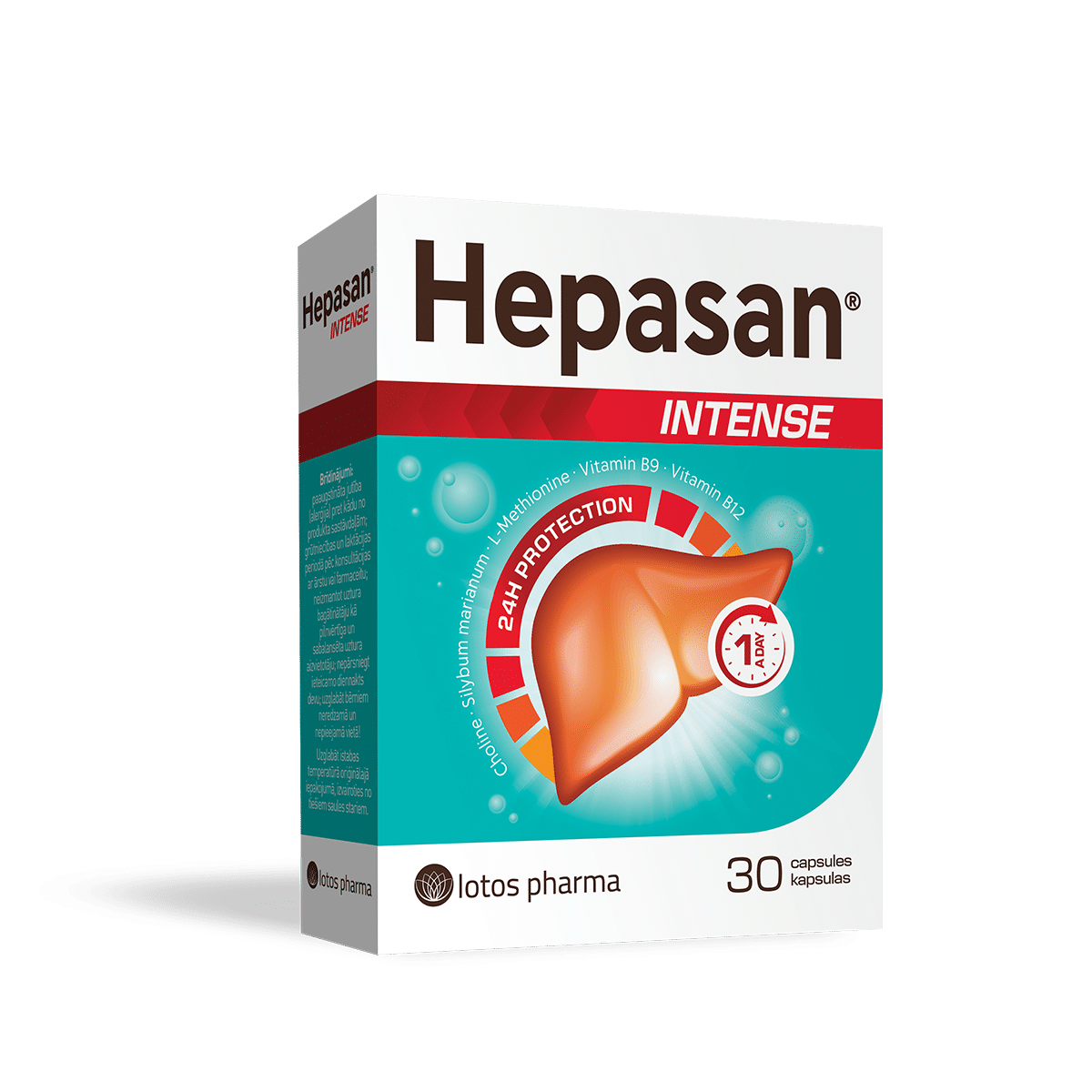 Hepasan INTENSE sudėtyje esantis cholinas padeda palaikyti normalią kepenų veiklą, normalią homocisteino ir lipidų apykaitą. Tikrųjų margainių sėklų ekstraktas padeda palaikyti normalią kepenų veiklą. Foliatai ir vitaminas B12 padeda palaikyti normalią homocisteino apykaitą.